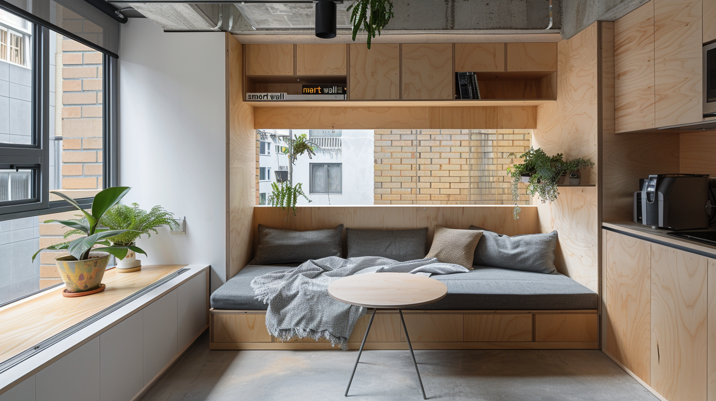 By utilizing standard, off-the-shelf materials (plywood, standard brick, concrete) in creative ways, we drastically reduce construction costs. The savings are reinvested into "The Smart Wall"—a custom joinery unit that runs the length of the apartment, hiding 100% of the household clutter, appliances, and storage, leaving the living space permanently open, calm, and dignified.
